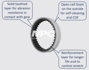 The Solution: Together with the OEM, MPC developed a mult-layer belt with varying hardnesses and coefficient of friction on each side, including a third layer for reinforcement. With its design, MPC was able to combine the functions of the rubber tires and timing belts into a single component.
